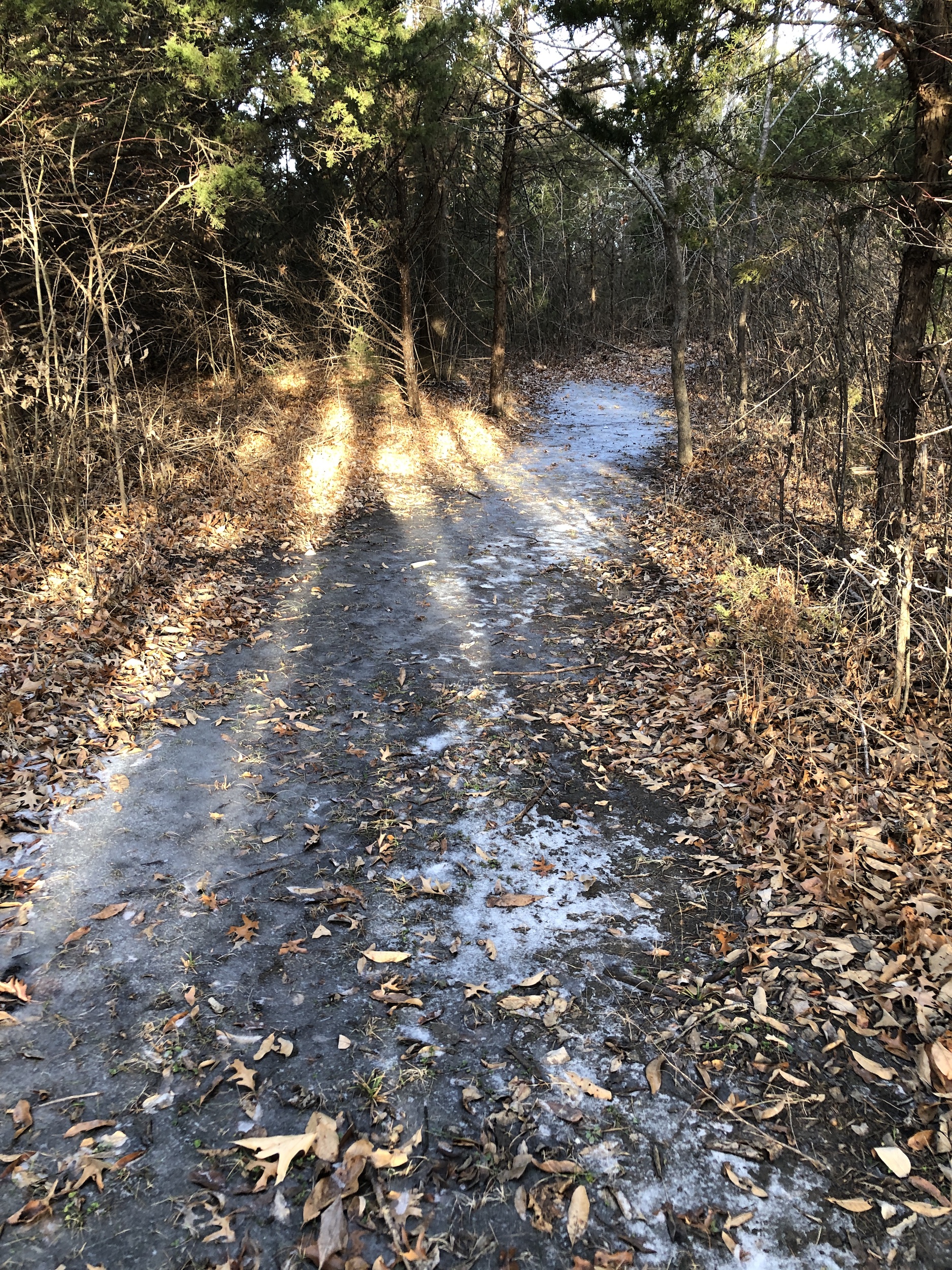 Even though the snow has been gone for a bit my trail remains icy in some spots. Quite a few actually. So I turn around.