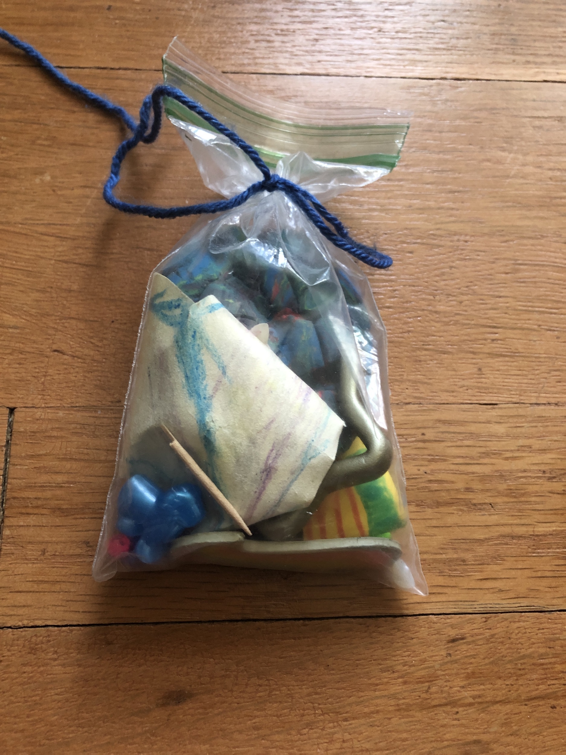 One of my granddaughters wrapped up some of her tiny trinkets, put them in a little bag and tied it with a piece of yarn.