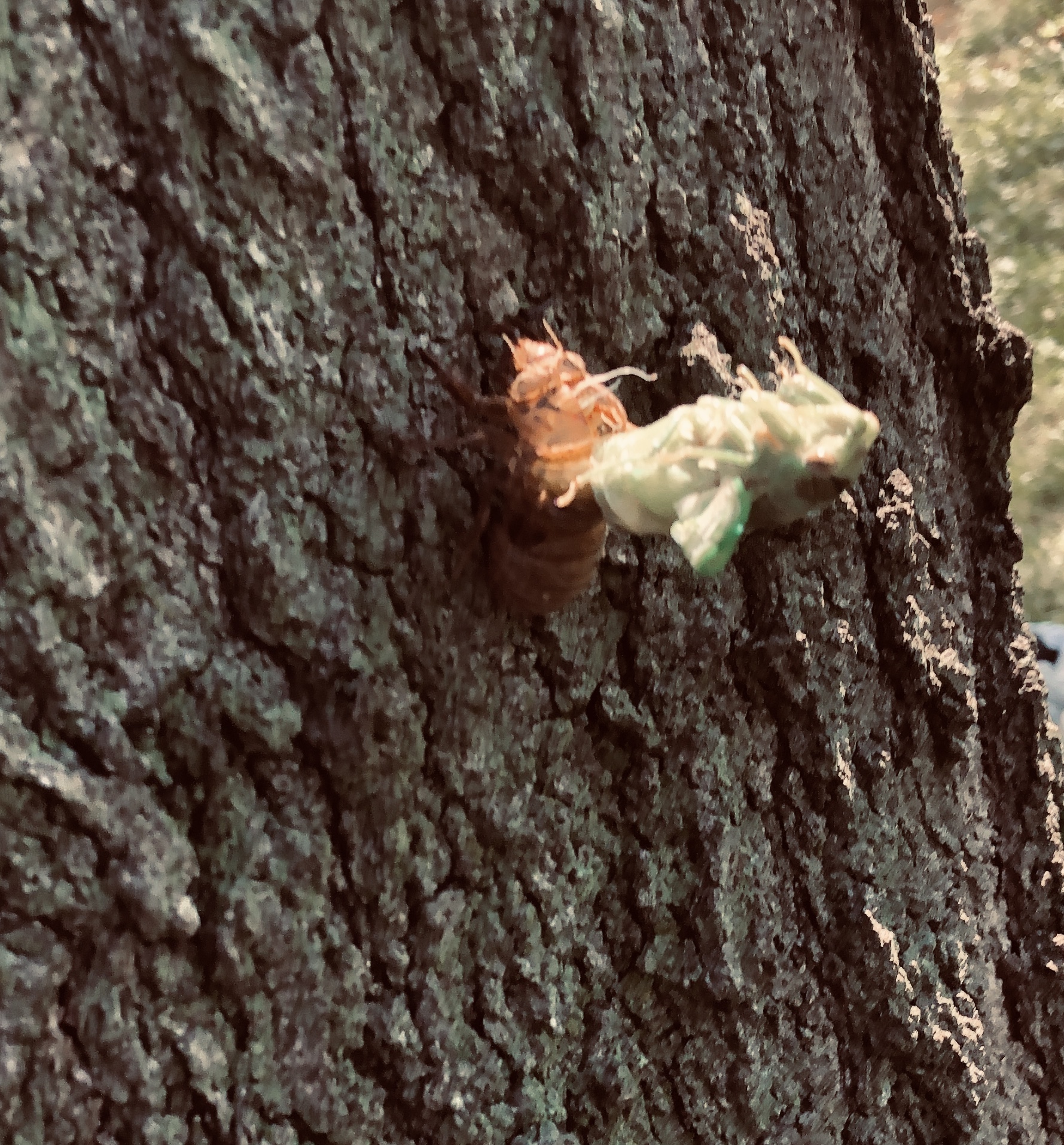 It’s not rare to find shed cicada skin. But, today we had a rare skin shirking cicada sighting. It shimmied and shook itself out of