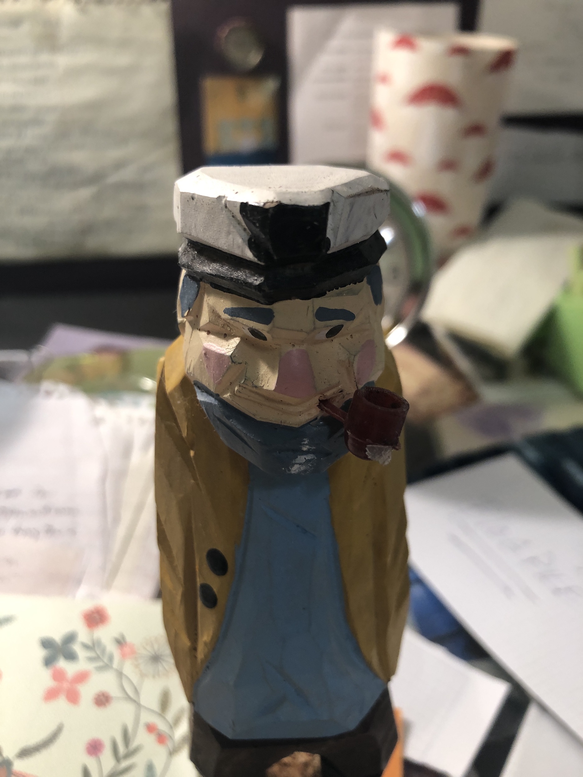 This lonely little sea captain usually sits in with one of my succulents. He looks over the room or out the window. He was banished