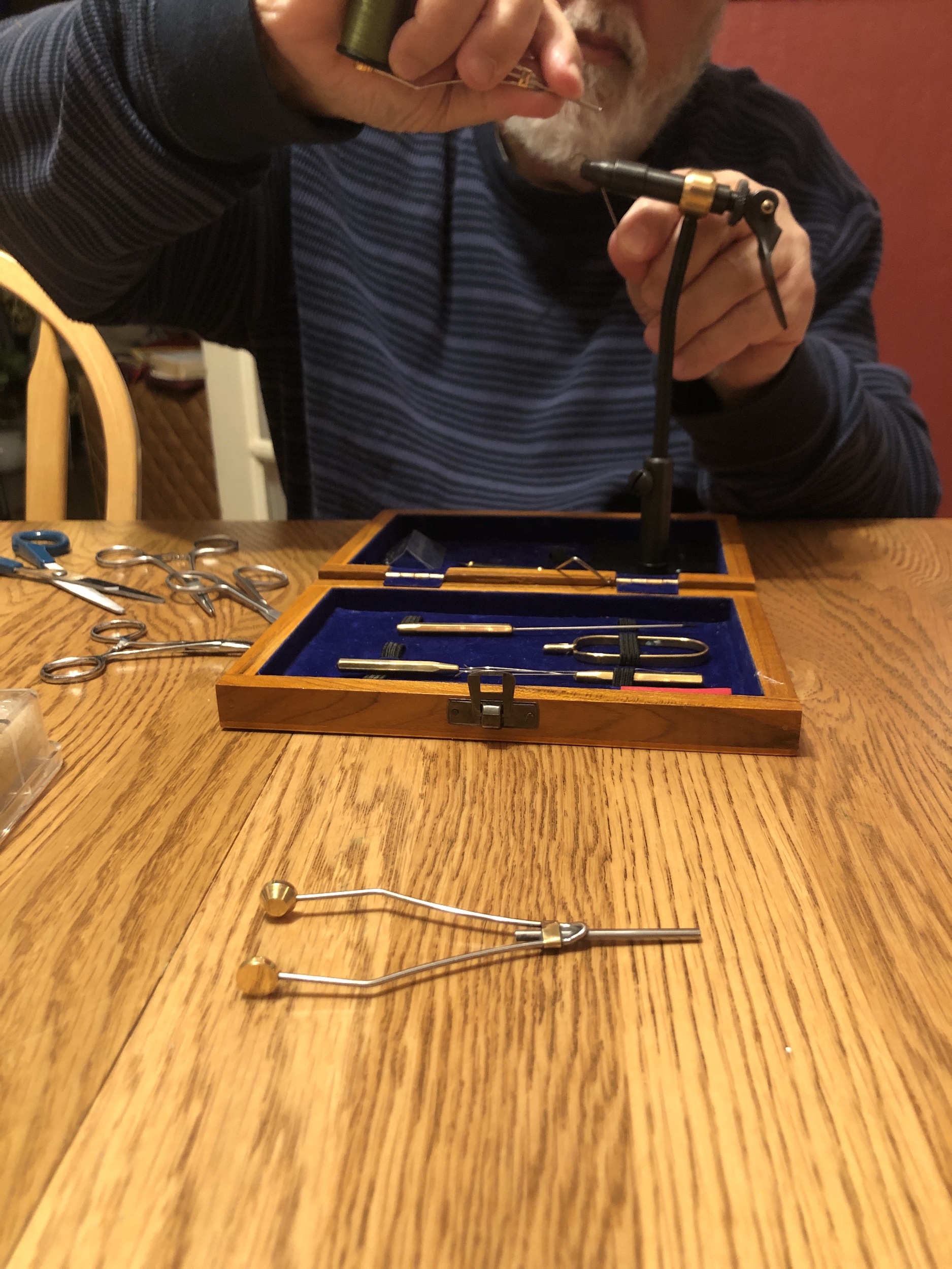 Mr. Fix-it has turned his hand to tying flies. The scissor collection is what caught my attention. When our kids were little, we owned one