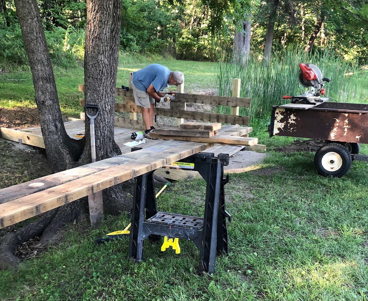 Mr. Fix-it is restoring/widening the bridge. We purchased a new lawn mower, and it is wider than the bridge. So, Mr. Fix-it drew out his