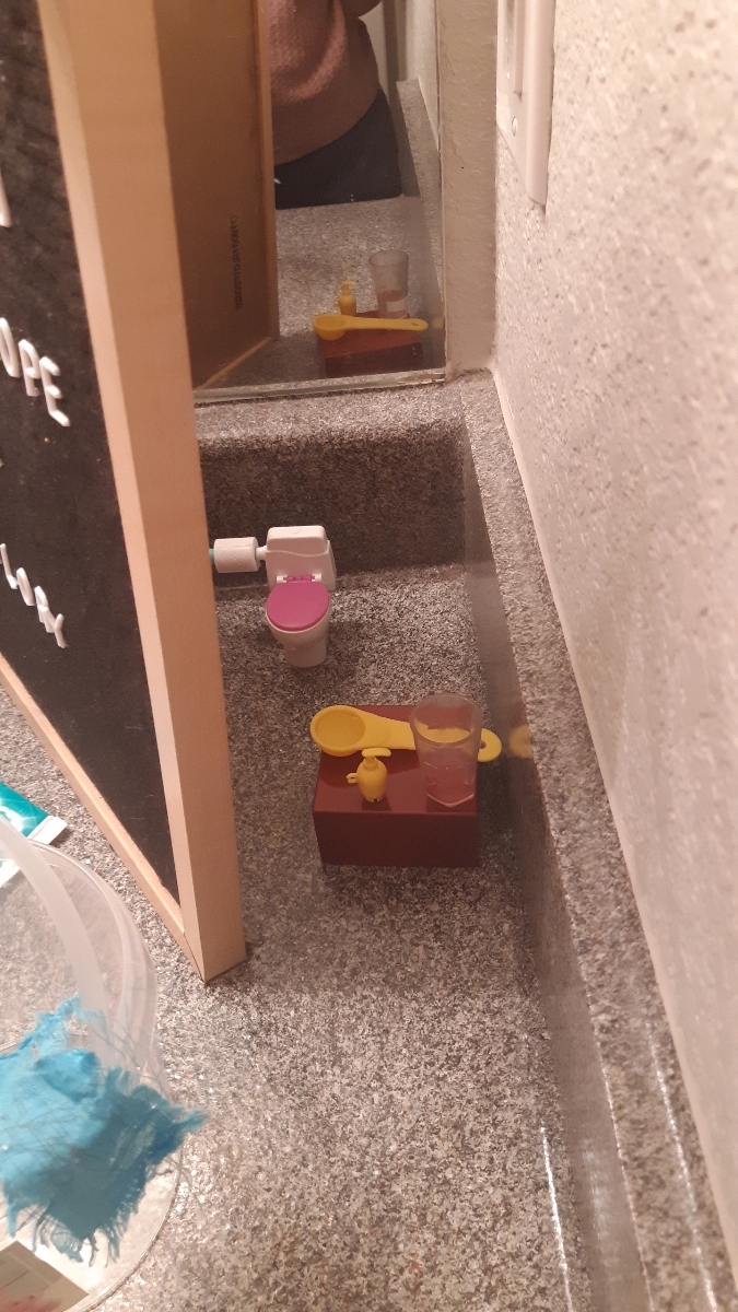 One of our grand kids is an avid “dolly” girl- Barbies, Polly pockets, Our generation. She set up a little potty on the bathroom counter
