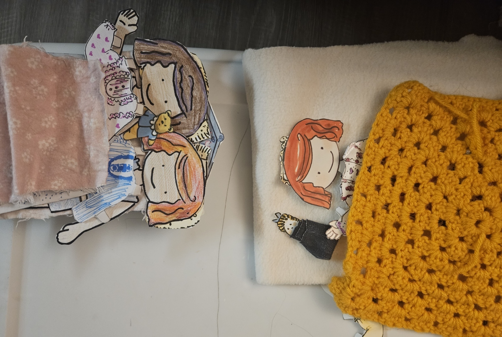 One of our grown girl’s children set to work with their Madeline Paper Dolls. Cutting clothes out and creating pajama sets. Even, making dollys for