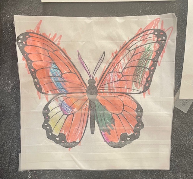 One of our grand kids said I could take this pretty butterfly home today. So, I said I would, and hang it up. I taped