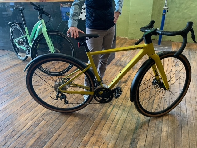 Look at my new gravel bike that Mr. Fix-it bought for me today. Isn’t she springy looking. Mr Fix-it and I went on a short ride