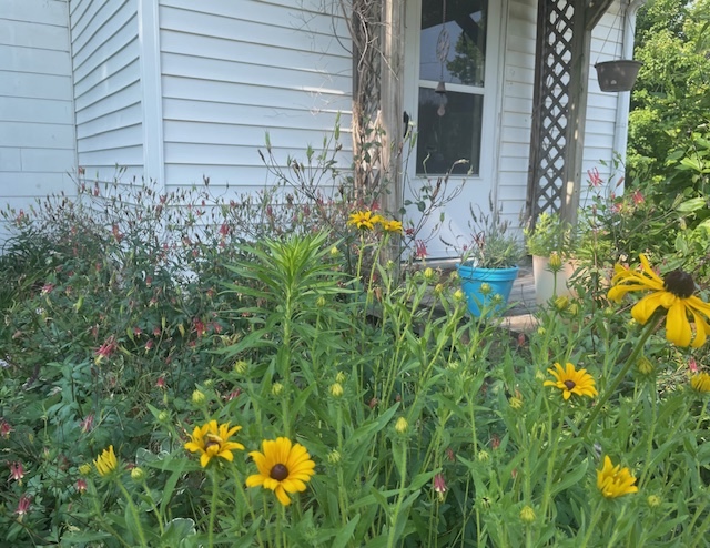 Yesterday, I walked with hubby around the perimeter of the garden-ish area. Pointing out the Black Eyed Susan, and Colombine, while saying, see self seed. They