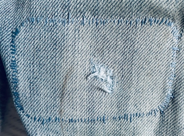 Mr Fix-it has gone a stitching… First he ironed the patch on then he stitched it. Beautifully, I might add. He did it on both